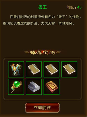 獸王這個BOOS在占據著百獸谷周邊的所有村莊,作為一個動物BOSS他爆發起來的能力非常強,玩家要是實力不夠還是別去擊殺他了,因為這個BOSS隨時都可以秒了你,獸王被玩家擊殺之后玩家就可以獲取40級綠色裝備、50技能書、材料、升星石等等。