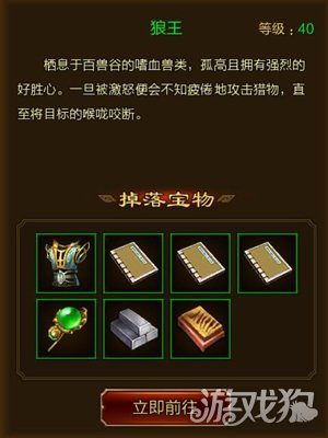 狼王這個BOSS的等級為40級所以高于50級的玩家都可以去擊殺這個BOSS,這個BOSS的掉落和獸王差不多,掉落的都是裝備和技能書,如果玩家想要獲取裝備的話我還是建議玩家去打狼王這個BOSS,因為這個BOSS掉落裝備的幾率會很大。